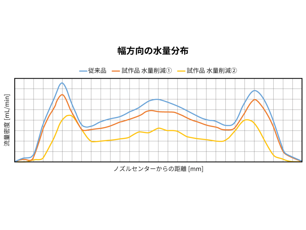 また、性能評価試験では、弊社の測定評価技術サービスの一つである「水量分布測定」を用いて、スプレー分布の評価と、従来製品との性能比較を行い、十分な性能を確認ました。